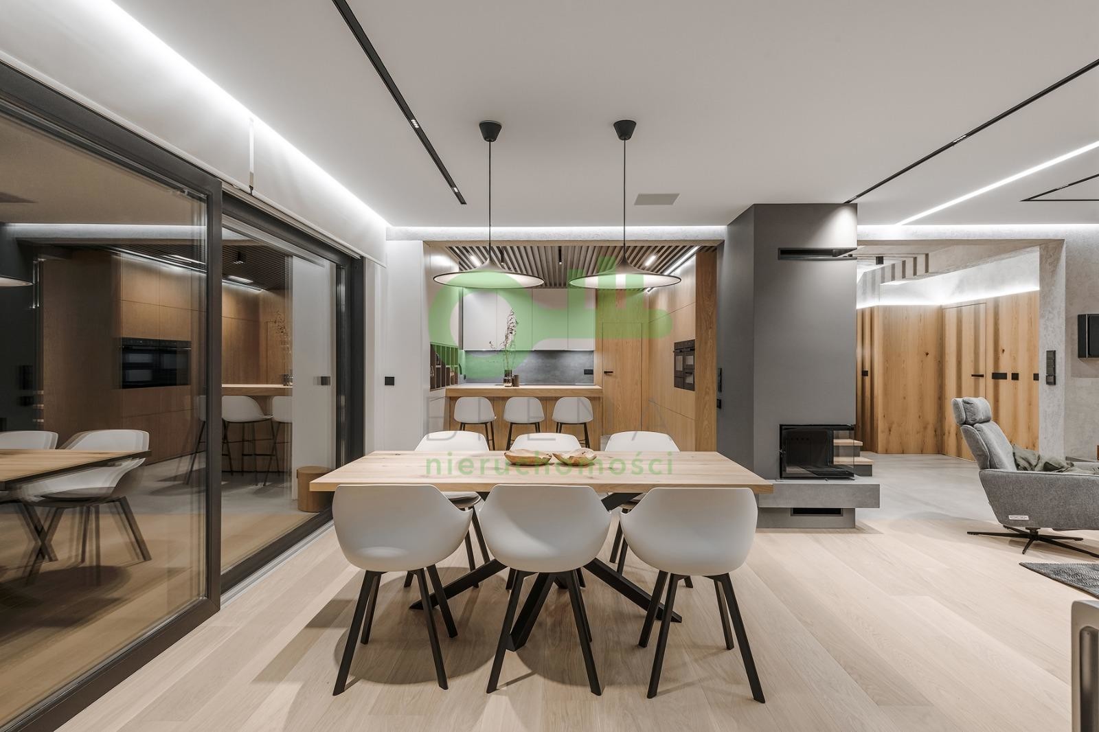 2. Strefa Dzienna (Parter / 134 m²) Reprezentacyjna część domu o otwartym planie:Przestronny salon z jadalnią, bezpośrednio skomunikowany z tarasem wypoczynkowym. Kuchnia z wyspą i ukrytą spiżarnią (sprzęt AGD wysokiej klasy), gabinet ciche miejsce do pracy zdalnej. Dwustanowiskowy garaż w bryle budynku.