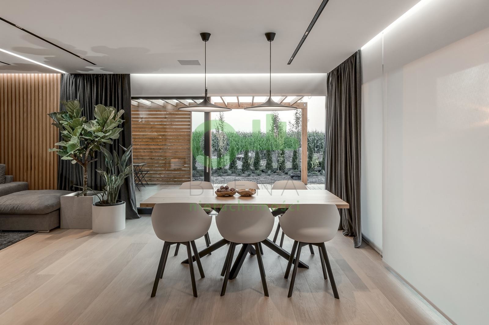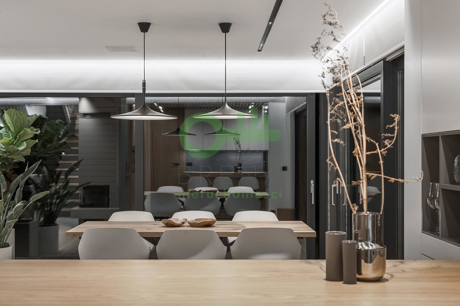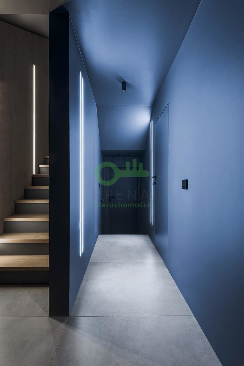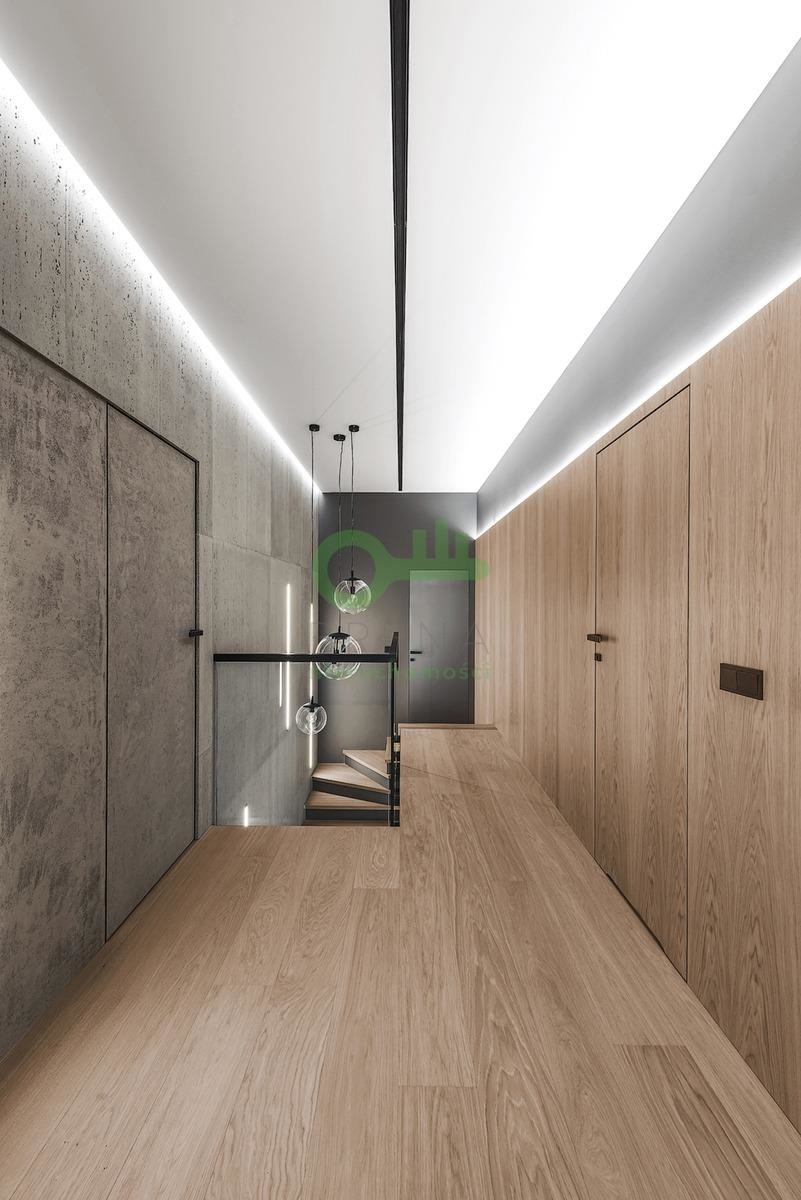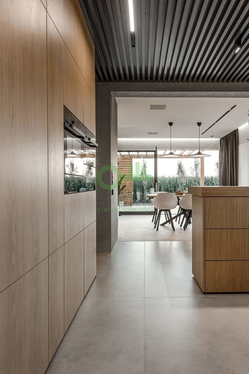 Dom o powierzchni całkowitej 510 m² usytuowany jest na widokowej, 11-arowej działce w drugiej linii zabudowy, co gwarantuje ciszę, prywatność i bezpieczeństwo.